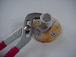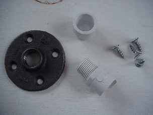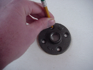 Place metal flange in center of board, mark screw locations, pre-drill 1/8" holes for screws. Mount flange and paint it white. File tips of screws on bottom of board if desired. |
